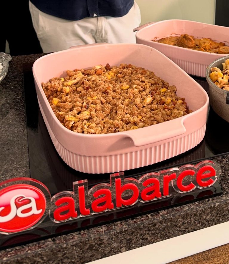 5️⃣ Tempere com sal a gosto, acrescente o pêssego e as maças picadas e por último o caldo do pêssego e finalize, se desejar, com cheiro-verde picado para um toque fresco.